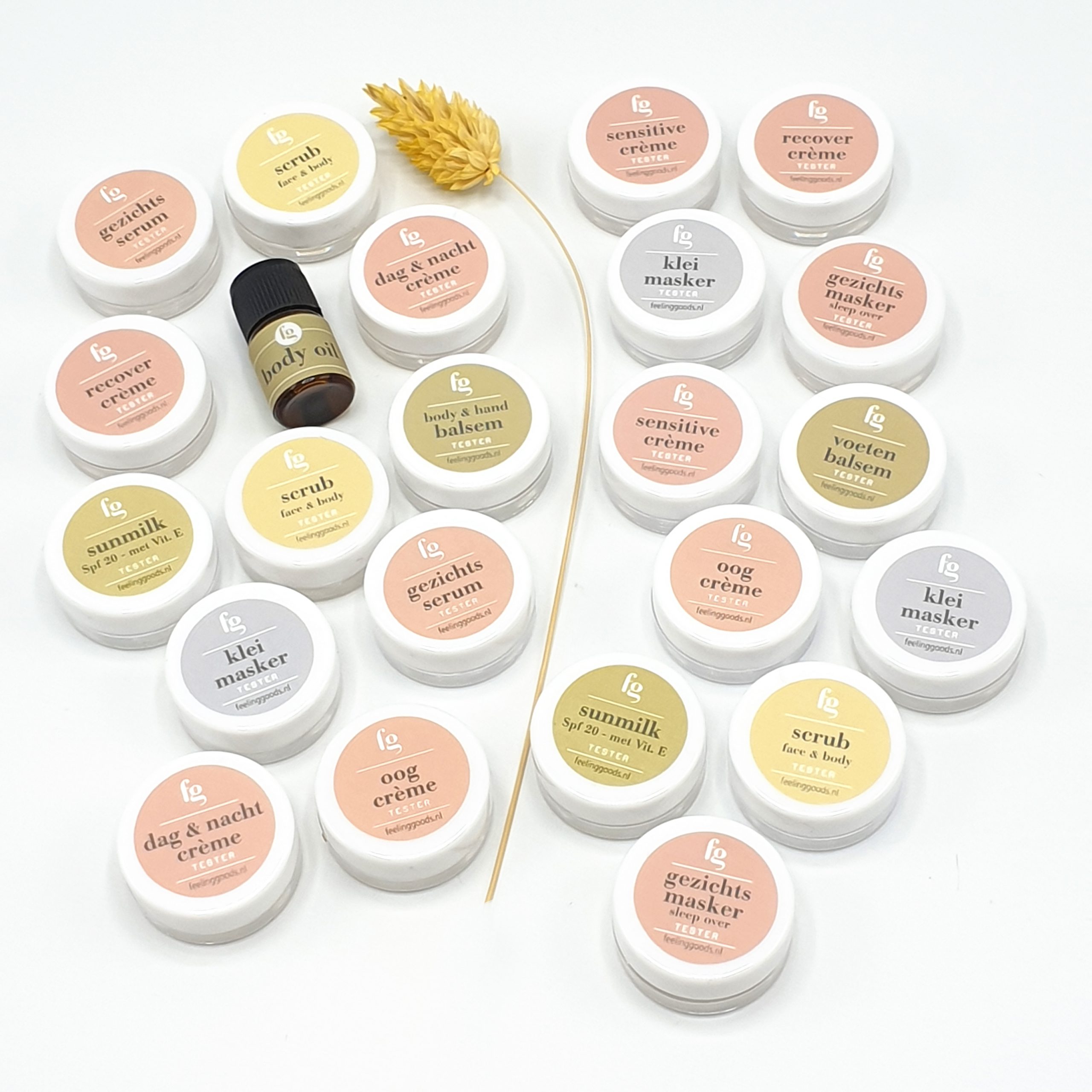 Voetenbalsem (2ml), body oil (2ml), sunmilk (2ml), face & bodyscrub (2ml), hand & bodybalsem (2ml)