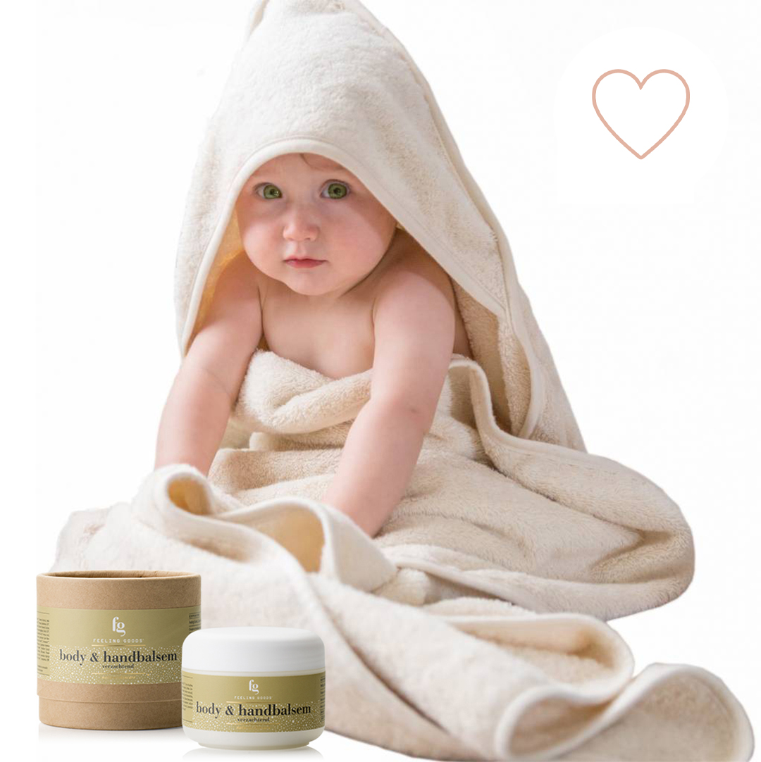 Het setje bestaat uit een zachte éçrukleurige handdoek van biokatoen met capuchon en een fijne body & handbalsem voor het zachte babyhuidje.